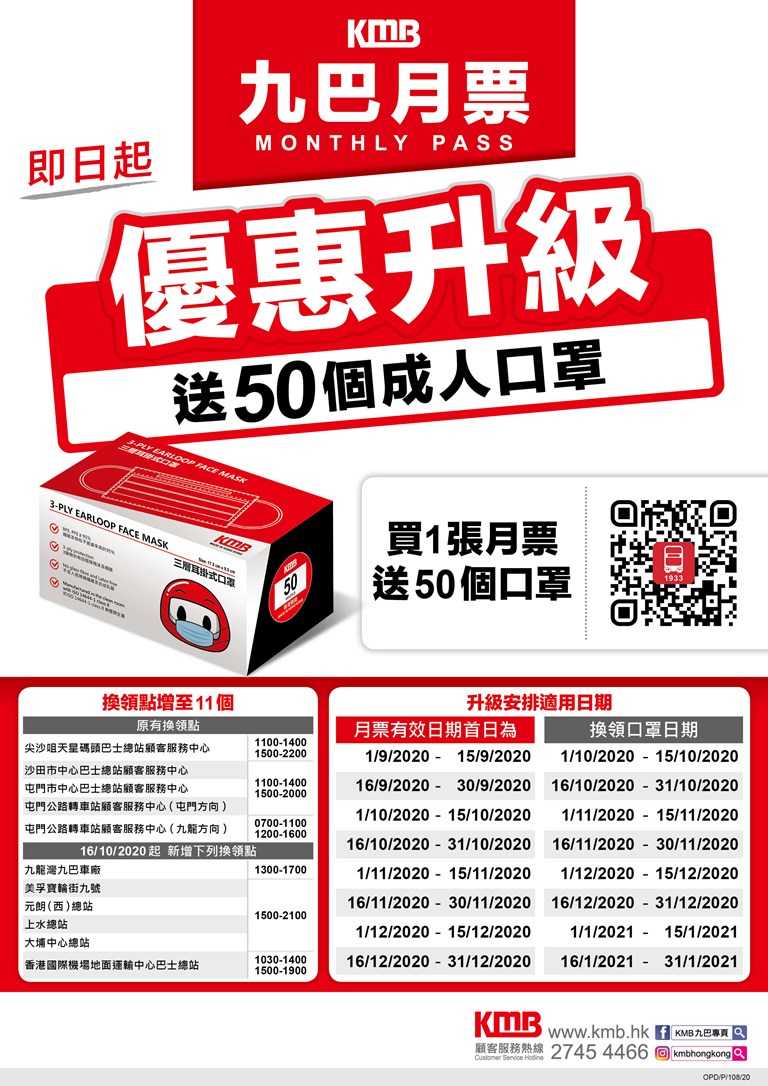 「九巴月票」冬季升級繼續賞 ( 2020.10.01 ~12.31 ) [ 九巴口罩 ]